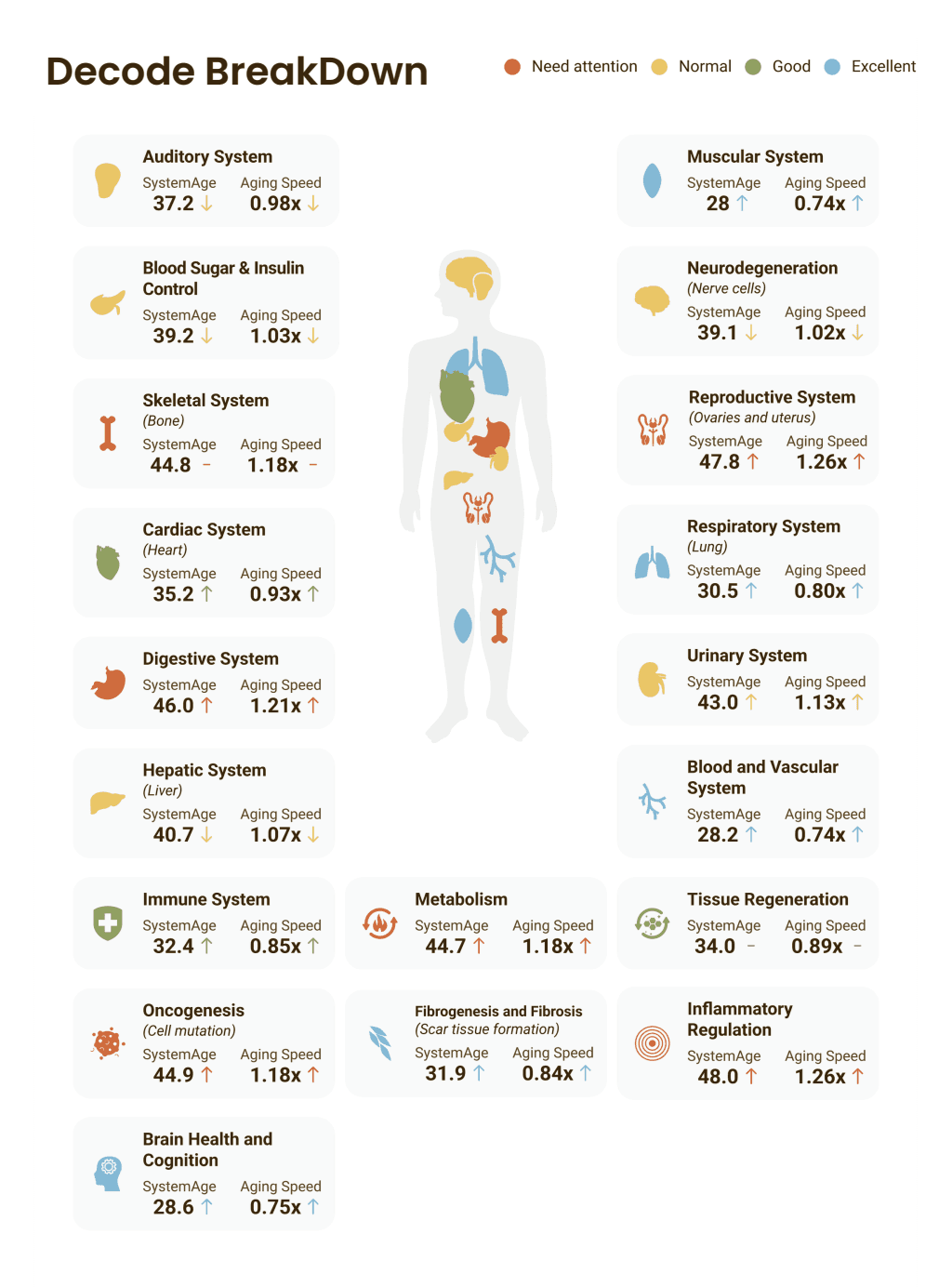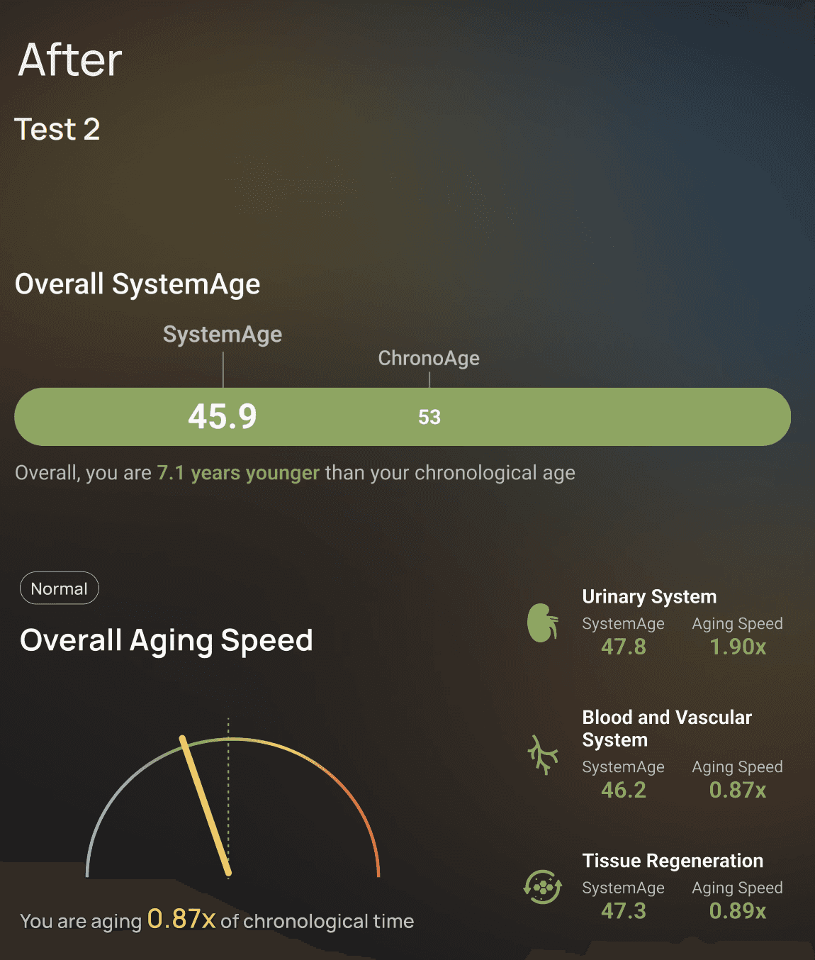 460 biomarqueurs analysés sur 21 systèmes clés (métabolisme, immunité, cognition, hormones…).